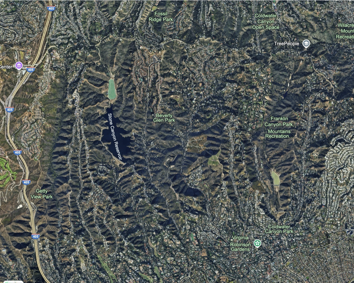Google Earth view of the limited development in the Santa Monica Mountains surrounded by urban sprawl.
